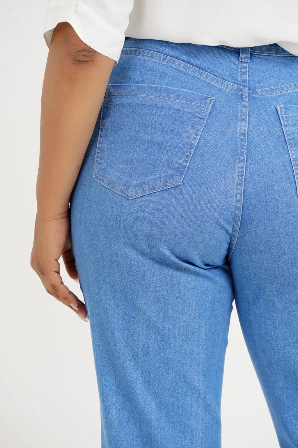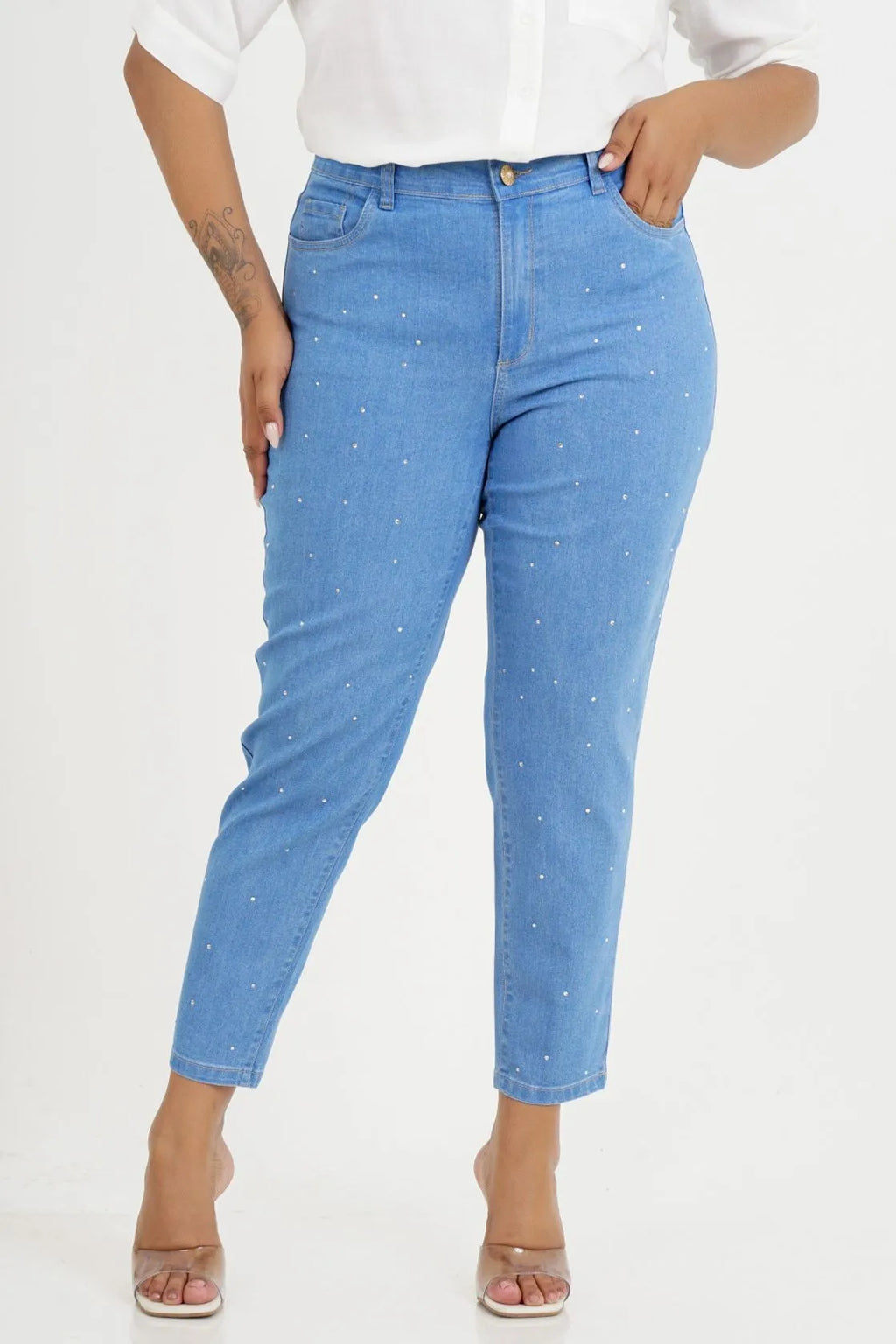 Calça em tecido plano de jeans, modelagem mom, lavagem clara com cós alto, largo, passantes padrão e fechamento frontal por botão e zíper. Possui bolsos frontais padrão, aplique de strass em todo o comprimento e nas costas pala finalizada também por dois bolsos padrão. Peça queridinha das fashionistas!