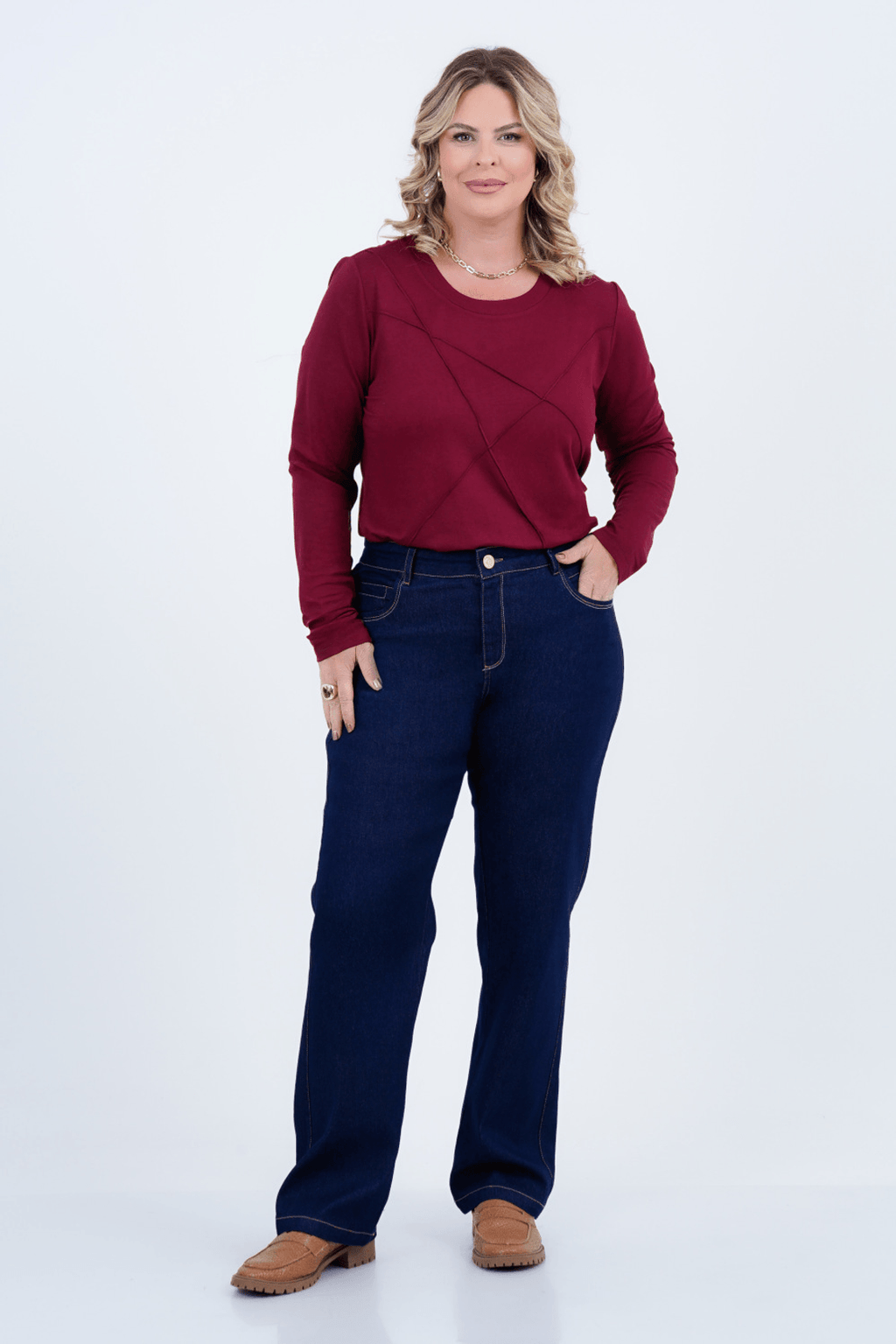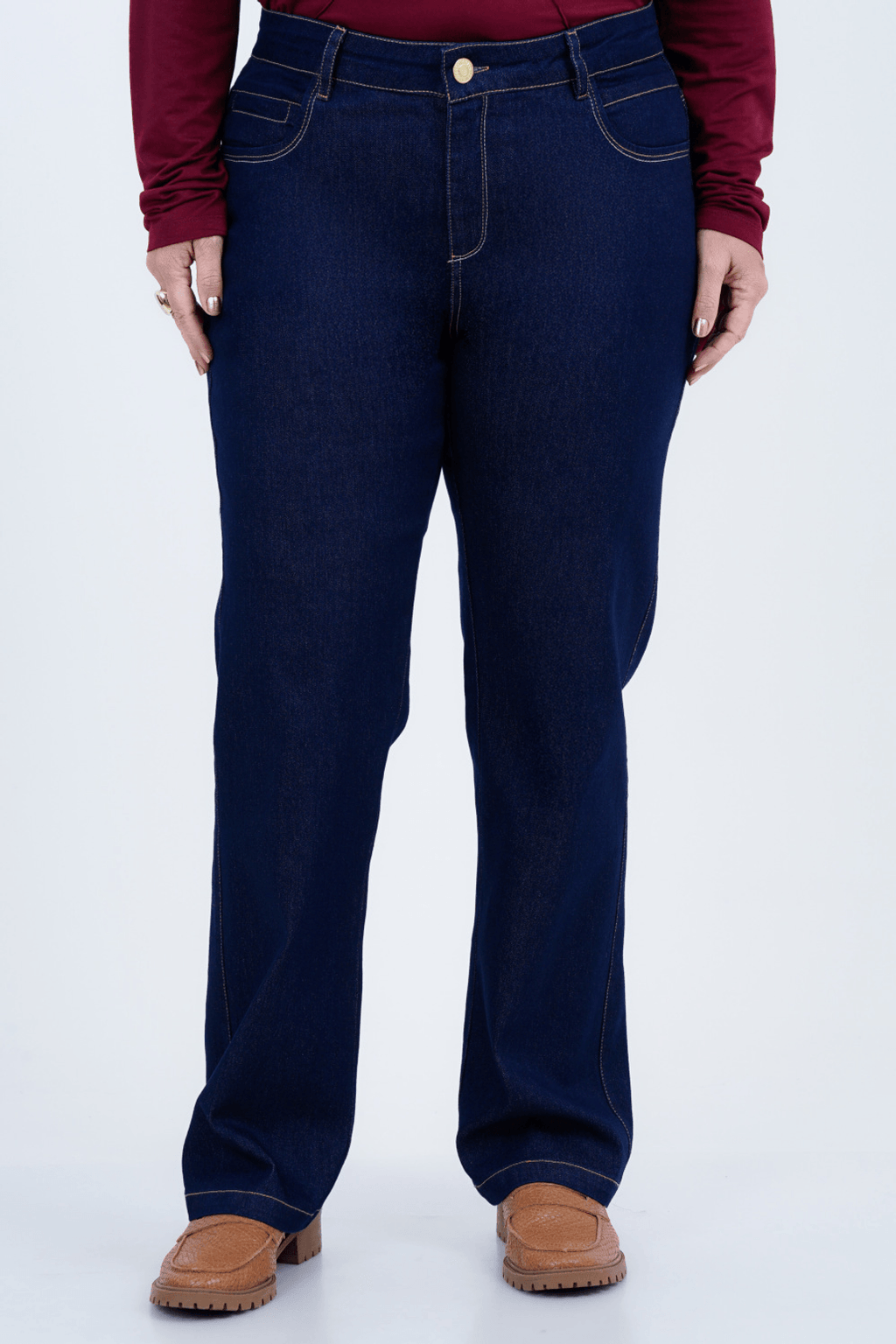 Calça plus size feminina em tecido plano de jeans liso, modelagem reta, cós alto e largo, passantes padrão e fechamento frontal por botão forrado seguido de zíper. Possui bolso pequeno seguido de bolso padrão e nas costas, cós alto seguido de pala finalizado por bolsos. Peça versátil, ideal para compor seus looks de inverno. O nosso tamanho G tem o comprimento de 108 cm.