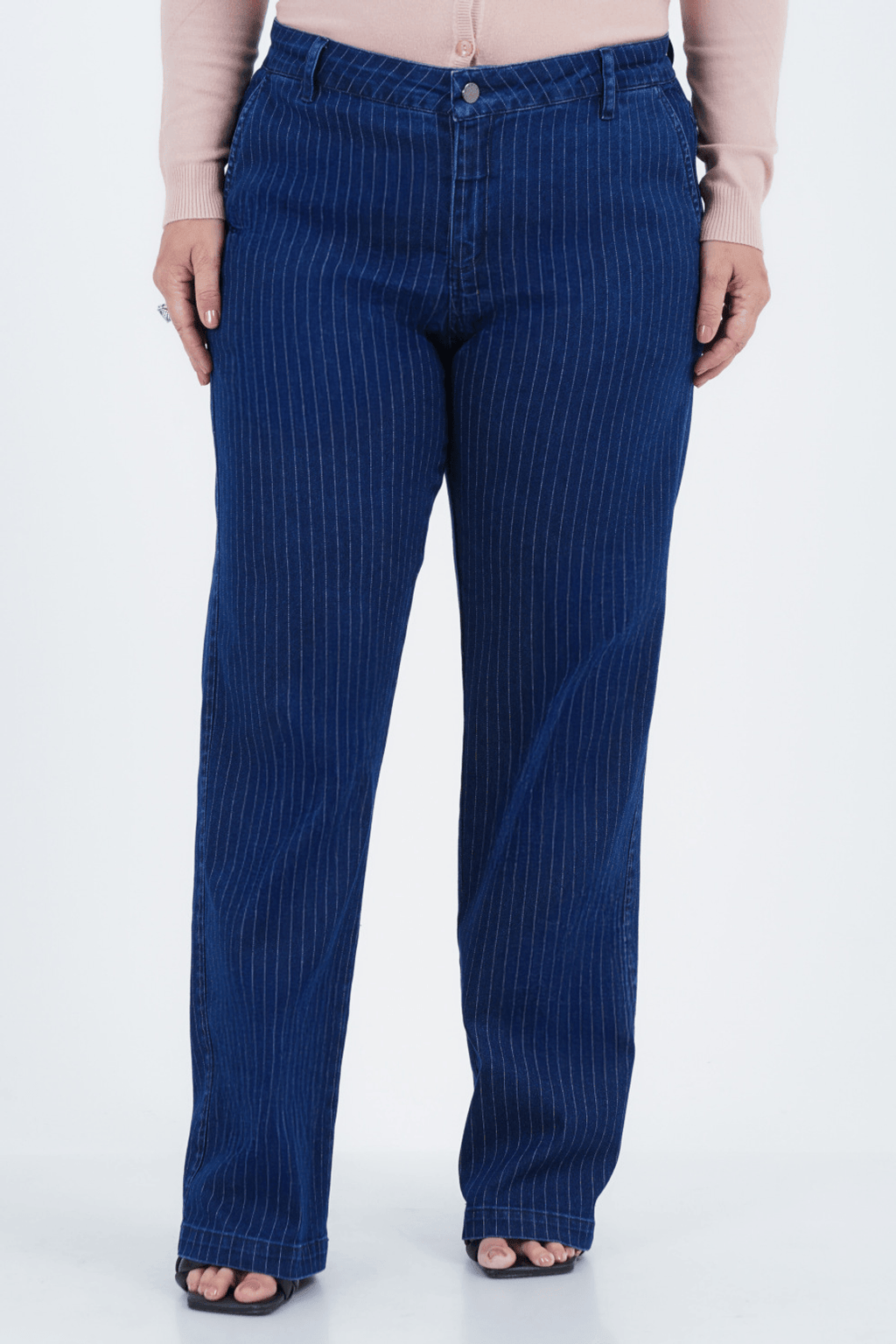 Calça plus size feminina em tecido plano de jeans listrado, modelagem reta, comprimento longo, cós alto, largo com passantes padrão e fechamento frontal por botão seguido de zíper. Possui bolsos frontais padrão e nas costas, cós acompanhado de pala finalizada por bolsos padrão. Peça versátil, tem que ter no guarda-roupa de inverno! Nosso tamanho G tem o comprimento 109 cm.