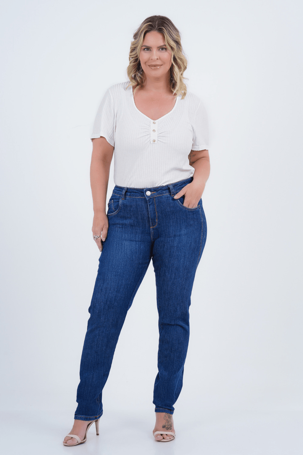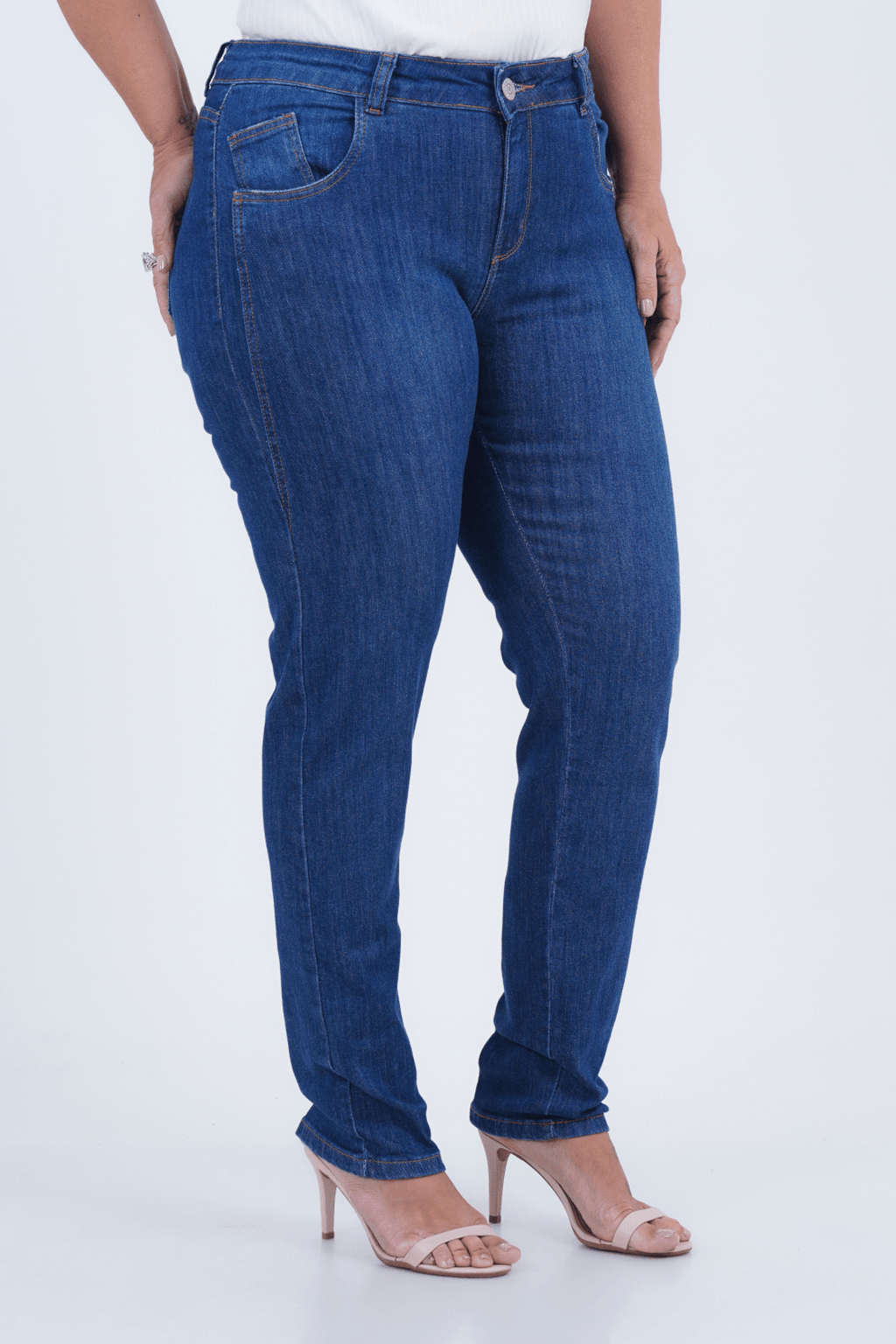 Calça plus size feminina em tecido plano de jeans liso, modelagem skinny, comprimento longo, cós alto, largo com passantes padrão e fechamento frontal por botão forrado seguido de zíper. Possui bolso pequeno seguido de bolsos frontais assimétricos e nas costas, cós acompanhado de pala finalizada por bolsos padrão. Peça versátil, tem que ter no guarda-roupa de inverno. O nosso tamanho G tem o comprimento 105 cm.