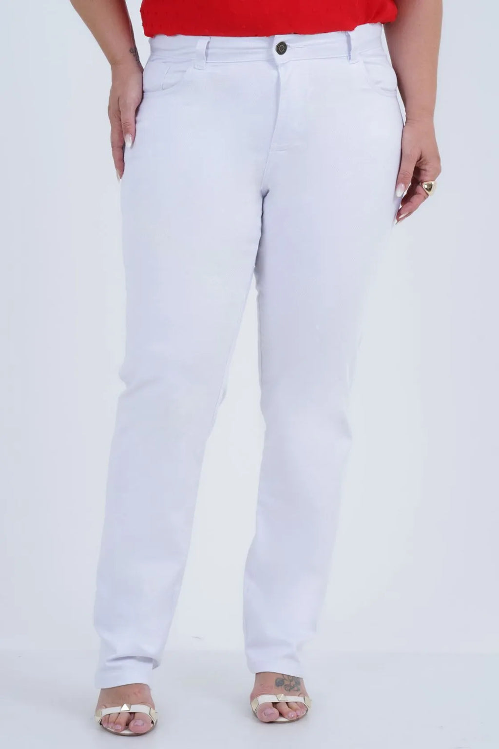 Calça plus size feminina em tecido plano de sarja lisa, modelagem reta, cós alto, largo, passantes padrão e fechamento frontal por botão seguido de zíper. Possui bolso pequeno seguido de bolsos padrão frontais e nas costas, pala finalizada por bolsos padrão. Peça versátil, ideal para compor seus looks de verão! Nosso tamanho G, comprimento 83 cm.