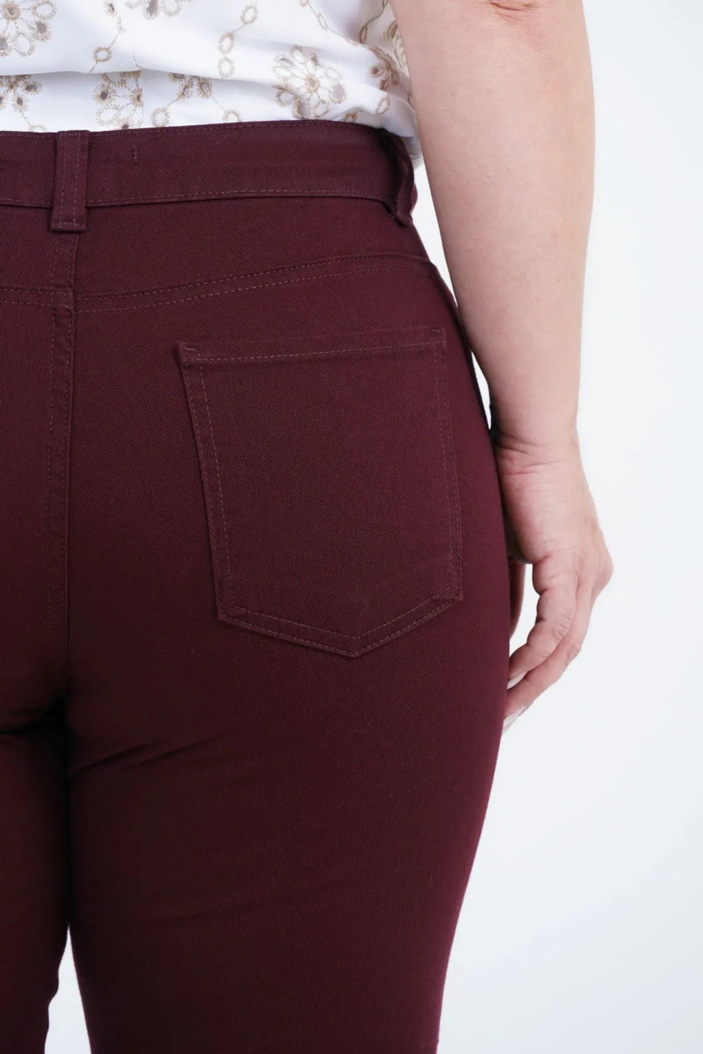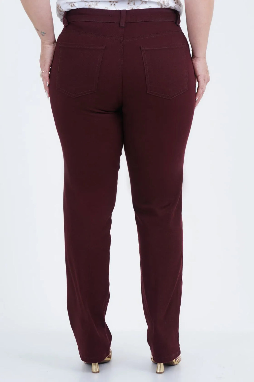 Calça plus size feminina em tecido plano de sarja lisa, modelagem reta, cós alto, largo, passantes padrão e fechamento frontal por botão seguido de zíper. Possui bolso pequeno seguido de bolsos padrão frontais e nas costas, pala finalizada por bolsos padrão. Peça versátil, ideal para compor seus looks de verão! Nosso tamanho G, comprimento 83 cm.